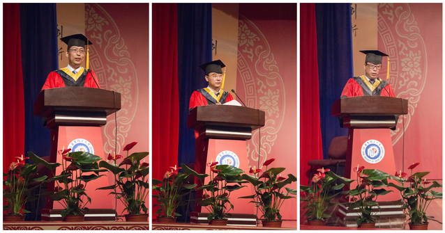 在过去一年里取得的卓越成果,勉励毕业生们展翅翱翔,向未知的疆界不断拓进。同时,他以师长的身份对所有毕业生提出三点希望。
