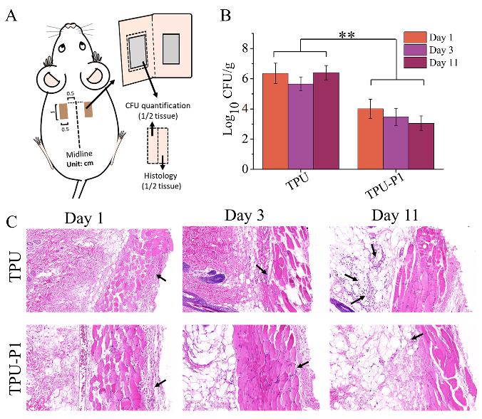 本研究中,为了获得微生物难以产生耐药性,同时具有高效抗菌活性以及良好生物相容性的生物医用材料表面,科研人员合成了一系列巯基封端的具有不同亲水性/氨基阳离子亚基和疏水性亚基比例的HDPs模拟物。将这些β多肽聚合物接枝于经等离子体活化以及溴化试剂处理过的聚氨酯表面,制备出β多肽聚合物修饰的生物医用材料抗菌表面;对革兰氏阳性菌以及革兰氏阴性菌表面抗菌活性测试表明可有效 杀死接触的细菌(图2)。溶血活性测试、血红细胞形貌表征、哺乳动物细胞毒性测试、体内皮下植入组织学HE染色(图3C)等相容性测试表明,经修饰的抗菌生物医用材料表面具有良好的生物相容性。