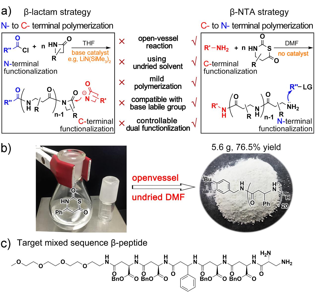 多肽在生命体中发挥着重要的生物学功能,是医药,组织工程,生物材料,生物学,化学等诸多领用的重要研究对象。但是,多肽本身结构不稳定,容易被蛋白酶水解,应用上受到很大限制。β多肽由β氨基酸构成,与天然多肽结构非常相似,具有突出的生物相容性和耐蛋白酶水解的优点,在上述多肽的各个研究领域备受关注。β多肽的合成,除了传统耗时耗力的逐步固相合成法,强碱性反应环境下的β-内酰胺开环聚合是目前最常用的β多肽快速合成方法。但是,β-内酰胺开环聚合的强碱性反应环境限制了对碱不稳定的功能基团和β多肽的结构多样性和应用,且聚合反应对水极为敏感,需要使用干燥溶剂在手套箱中操作。