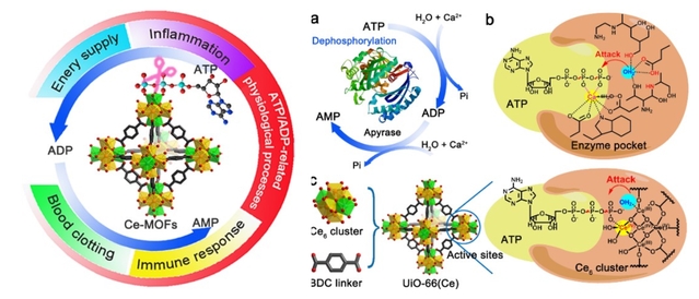 近年来,金属有机骨架(MOFs)作为一类快速发展的多孔晶体材料,它们的有序多孔结构提供了丰富和高活性的金属位点,使MOFs作为仿生催化材料具有独特的吸引力。研究人员发现:与天然腺苷三磷酸双磷酶相比,仿生的Ce-MOF具有二价阳离子独立性,不依赖于钙离子作为辅因子以结合和极化ATP 或ADP的末端磷酸基团,同时具有宽泛的工作条件和出色的稳定性。能够在生理条件下,选择性催化水解ATP和ADP的末端磷酸酯键,而对AMP和其他非核苷磷酸酯中的磷酸单酯键不具有显著的水解活性。在脱磷酸化机制中,Ce(IV)-OH起到了关键性作用,Ce(IV)能够有效地结合和极化ATP的高能磷酸键,使其能够受到表面羟基或水分子的亲核进攻而水解;而少量Ce(III)可能作为协同位点,促进水分子的亲核进攻,提高水解效率。