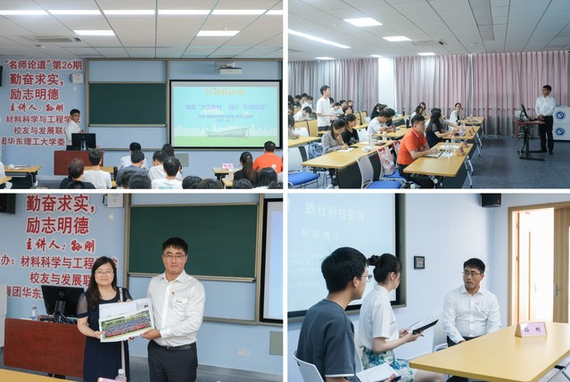 、校团委、校友与发展联络处共同主办的第26期“名师论道”在奉贤校区C301举行。孙刚受邀作“铸造大国新材,践行科技强国”专题报告。学院党委书记袁媛、党委副书记戴诚安、校团委副书记王寅申、学院教师以及近百名学生参加活动。