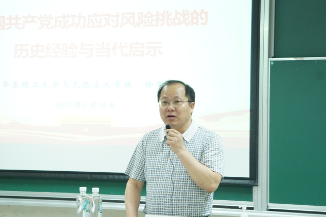 马克思主义学院副院长徐国民教授为师生党员带来了一场《中国共产党成功应对风险挑战的历史经验与当代启示》的精彩报告。他用鲜活的史实从历史和现实的维度深刻阐释了中国共产党百年来应对重大风险挑战的历程和化解风险的智慧、勇气和伟大成就。从我党成功破解各种困境的历史事件中,大家获得了力量,也坚定了永远跟党走的理想信念,提高了政治站位和思想格局。