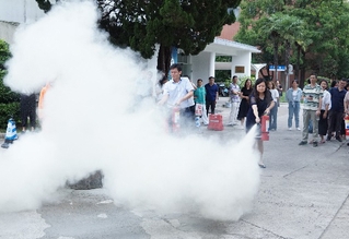 随后,学院在实验一楼东门外的空地上开展了灭火演练。段凯洋老师向大家讲解了灭火器的基本知识和使用要点。校保人员点燃起两个着火桶,每位教师都拿起灭火器进行了操作练习。在练习过程中,校保人员不时提醒操作规范,并纠正错误动作。