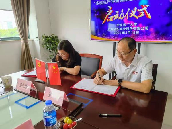 与上海强华实业股份有限公司本科生产学研实践基地签约及揭牌仪式成功举行,漕泾镇党委书记陈立俊、漕泾镇副镇长王红亮、漕泾工业区总经理李礼、强华股份总经理周文华、强华股份战略决策咨询顾问韩宝富、强华股份Etch项目负责人周韦军,华东理工动漫之家