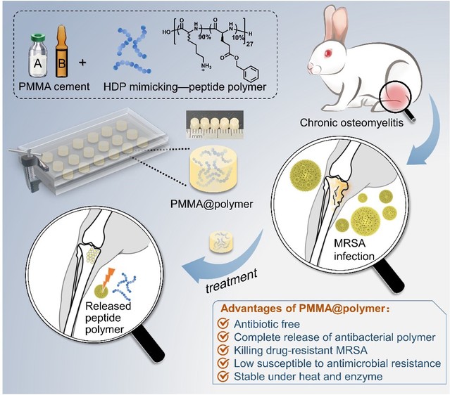 慢性骨髓炎的治疗通常需要多次手术和长期抗生素干预,复发风险高,给患者带来巨大痛苦和经济负担。目前,载有抗生素的PMMA骨水泥已广泛用于临床治疗慢性骨髓炎。然而,非降解PMMA骨水泥中抗生素的释放通常缓慢且不完全,导致局灶性病变处抗生素浓度不足,治疗效果不佳。此外,抗生素耐药菌的迅速出现给慢性骨髓炎的治疗带来了巨大挑战。因此迫切需要找到非抗生素疗法治疗耐药菌感染引起的慢性骨髓炎的有效策略。