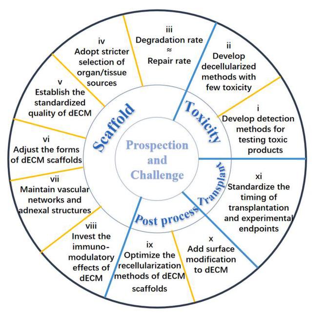 事实上,在过去的十年里,脱细胞支架的发展在持续并且深入地进行,并且在临床中也得到应用,但其仍然需要克服许多挑战。例如脱细胞支架在制备的过程中尚未建立一套标准来衡量脱细胞效果和成分保留效果,也未能找到一套精确的方法来评估和降低各种脱细胞试剂的细胞与组织毒性;后处理过程中,灭菌方法的选取和再细胞化仍存在困难;后续植入过程中,也面临着临床标准的缺失。脱细胞技术的发展和脱细胞支架的应用仍是解决组织修复和再生的有力工具,脱细胞支架可以提供一个仿生的微环境,允许干细胞和其他生物活性物质的添加,这或许是解决未来组织工程和再生疗法问题的一个优化解决方案。
