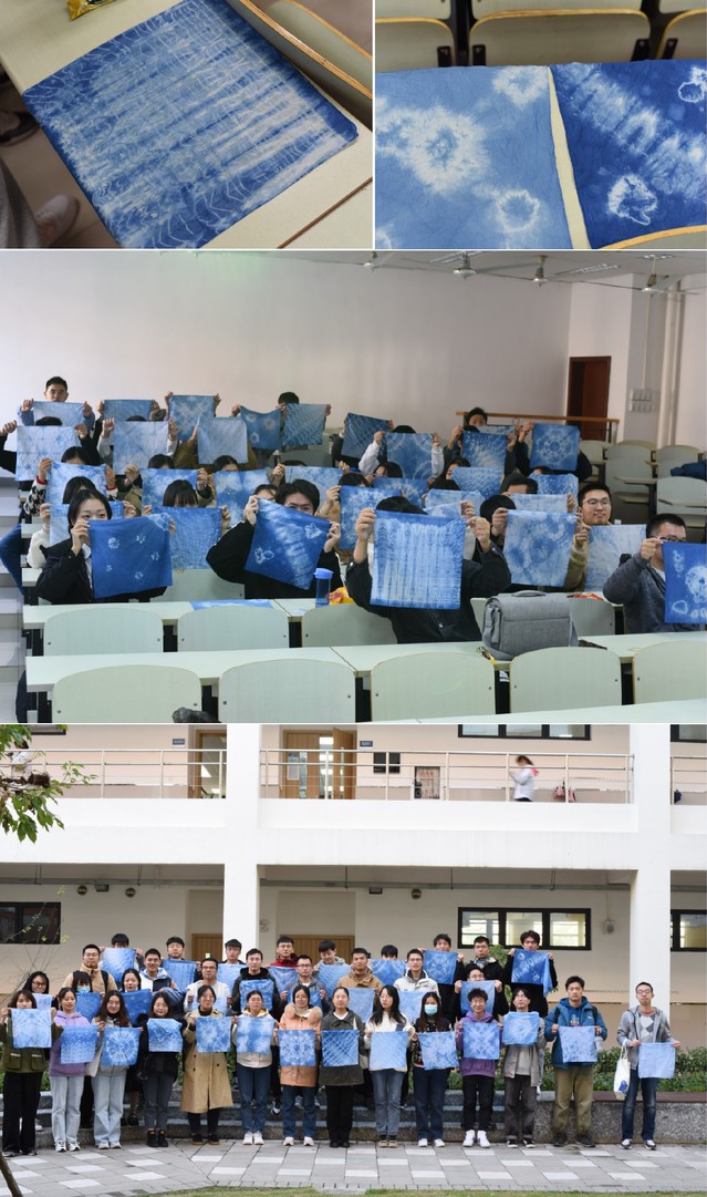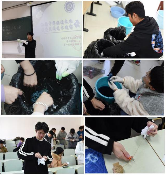 ①王增国在讲解扎染方法②染料的调制③④同学们亲自动手DIY扎染⑤⑥同学们在染料桶中染色、清洗
