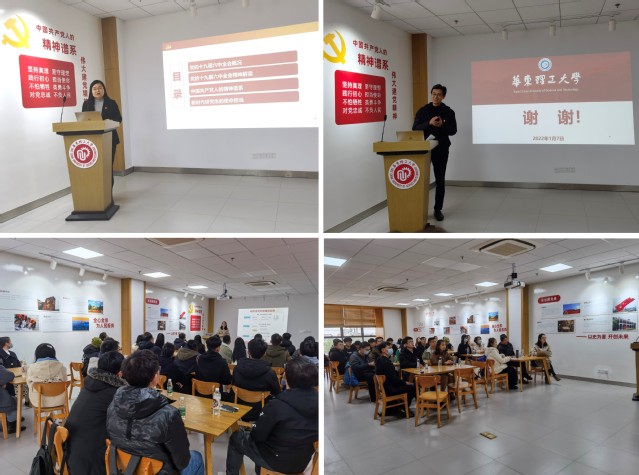 党委书记袁媛在奉贤校区大学生活动中心党建空间,为研一党员上“以史为鉴、开创未来——学习贯彻党的十九届六中全会精神”专题党课。学院党委副书记苏建玲、戴诚安,专职组织员鲁宁宁、研究生辅导员娄梦蝶以及部分研一党员参加活动,活动由戴诚安主持。