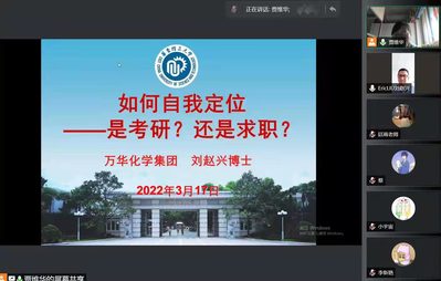于2022年3月17日下午14:00以视频会议的形式,举行了题为“如何自我定位——是考研?还是求职?”主题交流会。万华化学集团的校友刘赵兴博士作为邀请嘉宾进行了经验分享、并为同学们答疑解惑。