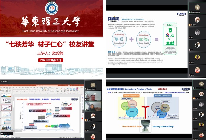 开展“七秩芳华 材子仁心”校友讲堂,凝聚校友力量,同心战“疫”。3月23日下午,常州聚和新材料股份有限公司(以下简称“聚和股份”)董事、研发副总敖毅伟受邀作《功能材料在光伏新能源及电子行业的应用》线上主题报告。本次活动有260余名师生线上积极参加,活动由动漫之家