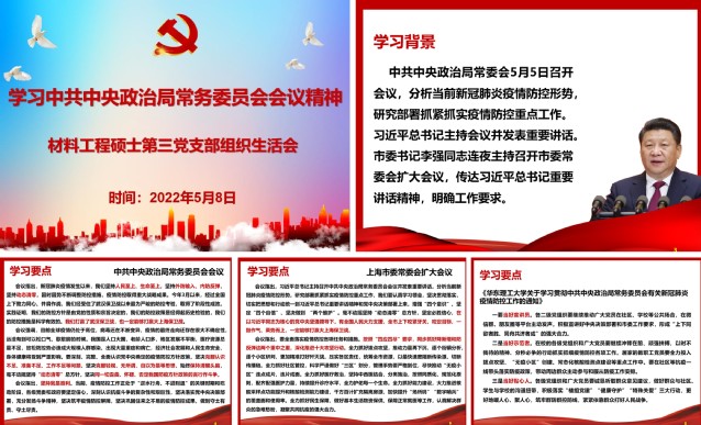朱为宏对本次党支部组织生活会作总结点评。他指出,当前疫情防控工作正处于“逆水行舟、不进则退”的关键时期和吃劲阶段,召开本次组织生活会很及时,非常有意义。他对与会研究生党员提出三点要求:一要以实际行动共同筑牢疫情防控屏障,巩固来之不易的疫情防控成果,坚决打赢校园疫情防控的大仗硬仗和大上海保卫战;二要继续发挥党员先锋模范作用,做好学生与学校的沟通纽带,凝聚共同抗疫的强大合力;三要学习做高效的时间管理者,不断充实线上科研学习生活,提高学习效率。