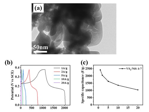 研究结果显示当复合比例为1:7时得到的复合材料,虽然仅相当于在NiS中引入12.5%的VS2,但比电容却比单纯的NiS增加100%以上,不仅这种复合材料本身具有优异的电化学性能,而且将其与活性炭组装成非对称超级电容器时,展现出了高的能量密度,在储能器件领域具有重要的研究和应用价值。