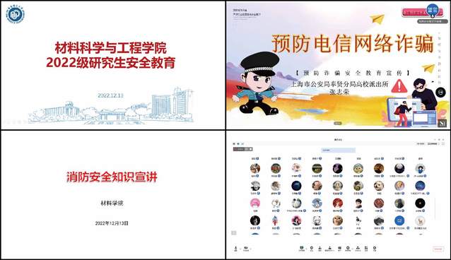 邀请党建共建单位上海市公安局奉贤分局高校派出所张志荣警官和校保卫处消防安全管理岗负责人段凯洋对2022级研究生进行安全专题教育。讲座通过线上方式进行,由学院研究生新生辅导员娄梦蝶主持。