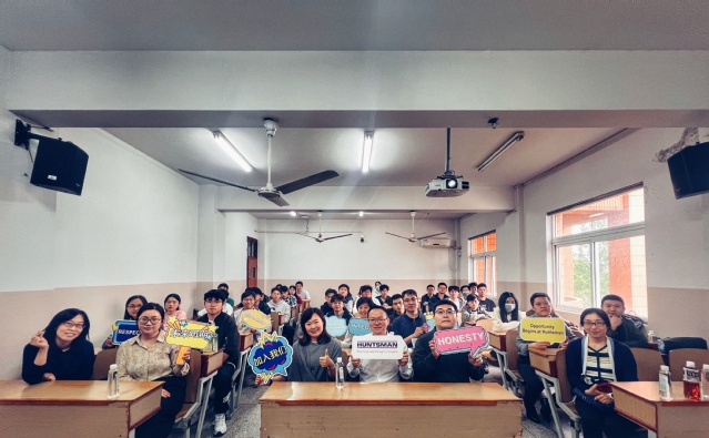 2018届博士毕业生王伟校友为师弟师妹分享了他们在学校的读博生涯、个人工作经历以及学习工作体会,热情邀请师弟师妹加入亨斯迈团队,鼓励师弟师妹积极到公司了解行业现状,找到合适的就业发展方向。