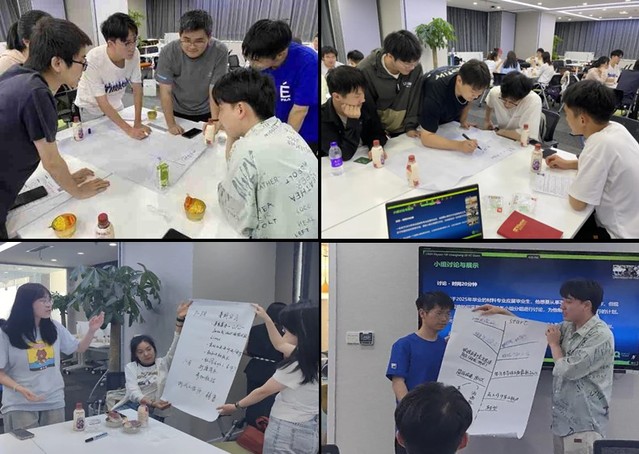 活动最后是团队合作展示环节。同学们被随机分成四个大组,围绕材料专业25届毕业生欲进入芯片行业的相关规划问题,进行了小组讨论,并逐一进行了展示与复盘。在展示复盘阶段,同学们不约而同地从升学、实习、校招等不同角度分析复盘,提出了各具特色的生涯规划路线,促进了同学们对求职就业的基本认知。