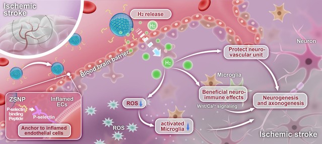 与传统药物分子相比,H₂具有多种显著优势,例如极佳的血脑屏障渗透性、快速的组织分布、高生物安全性以及抗氧化和免疫调节作用。然而,由于其快速扩散和缺乏靶向性,无论是静脉/口服富氢水还是吸入氢气都无法在病灶处维持高浓度的氢分子,这极大地限制了氢分子疗法的疗效。目前,如何在脑卒中病灶部位实现持续的氢气释放而不导致颅内纳米颗粒积聚仍是一个难题。本研究通过与P-选择素结合肽修饰的ZrSi2纳米颗粒(ZSNP),开发了一种针对炎症血管的锚定型产氢系统。该设计可在不穿透血脑屏障的基础上,通过水解在稳定长周期持续产生H2,并且不会引发明显的pH波动。