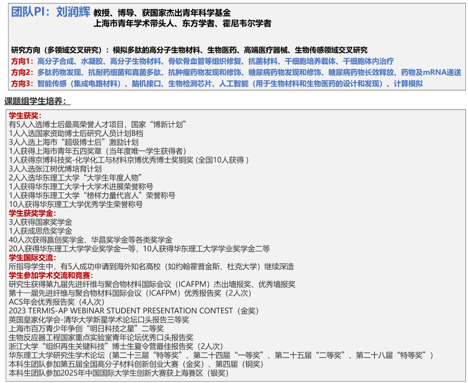 聚焦于生物医药、生物材料领域抗耐药菌感染研究,通过模拟天然多肽,设计发现抗耐药菌非天然骨架聚多肽。以第一/通讯作者在Nature Biotechnology、Nature Microbiology、Science Translational Medicine、Nature Communications(2篇)、Angewandte Chemie International Edition(3篇)、Advanced Functional Materials 等期刊发表研究论文26篇,论文成果多次被国家自然科学基金委收录为基金资助重要成果。申请PCT专利1件、中国专利5件(3件授权)。入选国家“博新计划”和上海市“超级博士后”,获国家自然科学基金青年项目和博士后科学基金面上一等项目等资助。